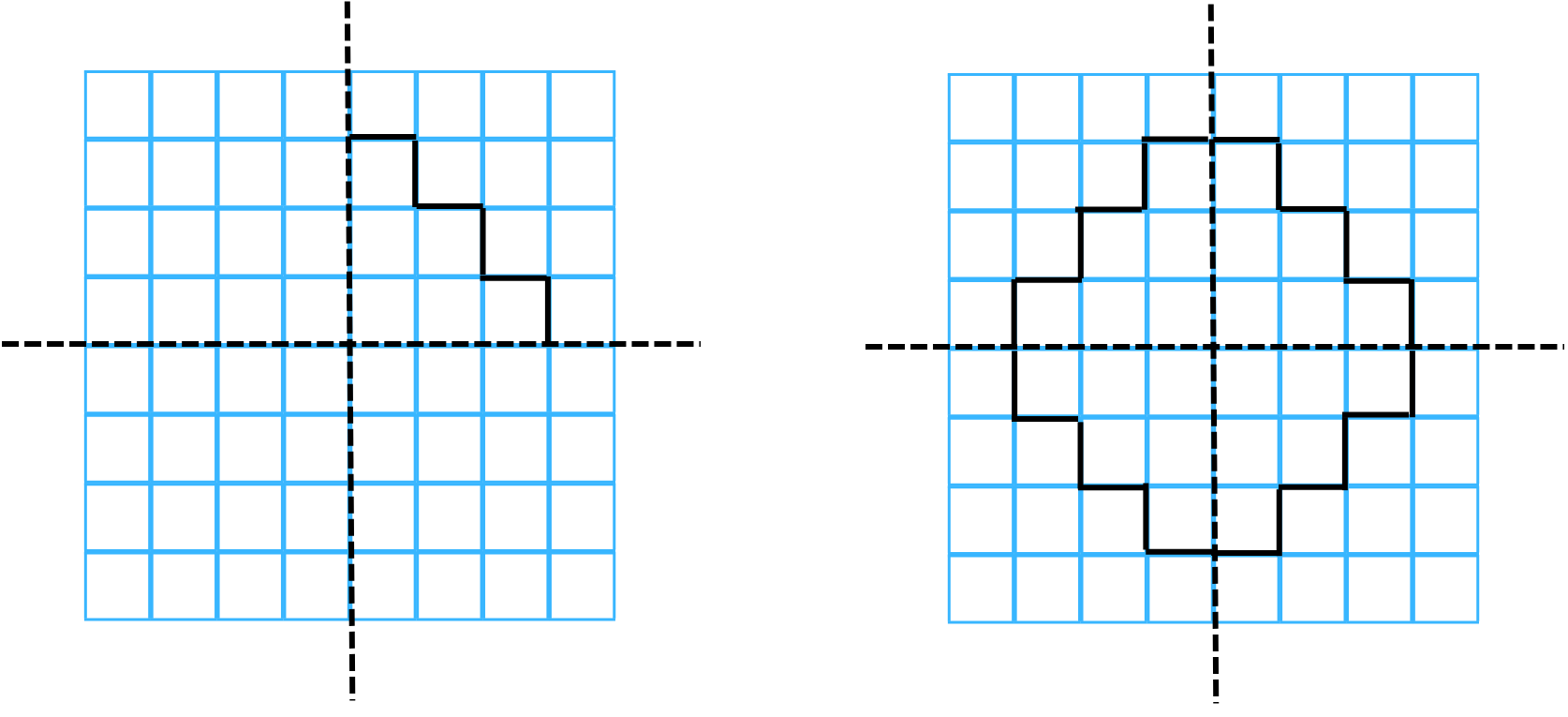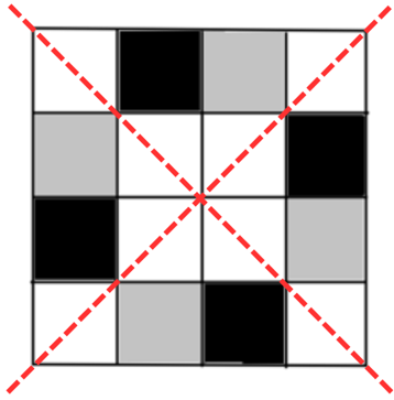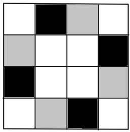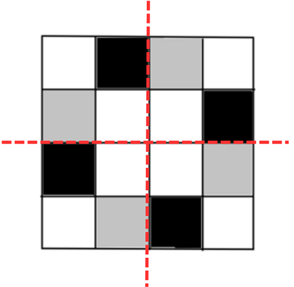 We take any one diagonal and shade the appropriate squares in grey to make the figure symmetric about it. As you can see in the completed figure below, there is more than one way to do that – we can make the figure symmetric about the other diagonal too by shading the appropriate squares. Therefore, the figure is symmetric about both diagonals.