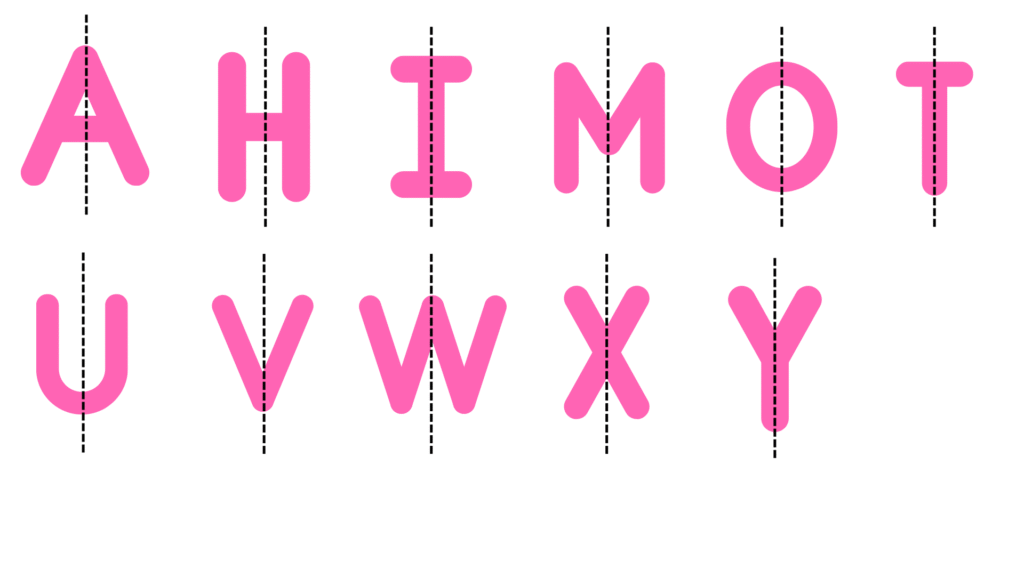 Answer: The letters which have reflectional symmetry about a vertical mirror are A, H, I, M, O, T, U, V, W, X, Y. The vertical line of symmetry or the vertical mirror line is represented by the dashed line as shown below: