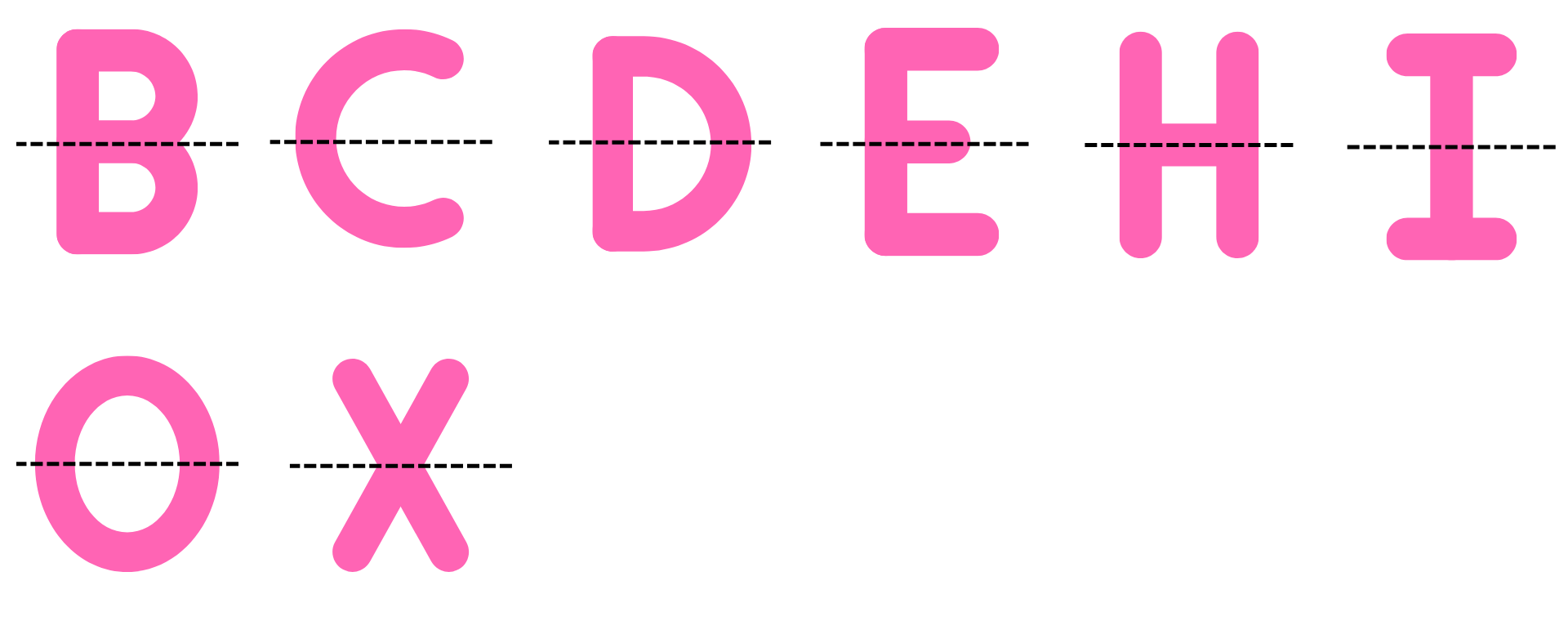 Answer: The letters which have reflectional symmetry about a horizontal mirror are B, C, D, E, H, I. The horizontal line of symmetry or the horizontal mirror line is represented by the dashed line as shown below: