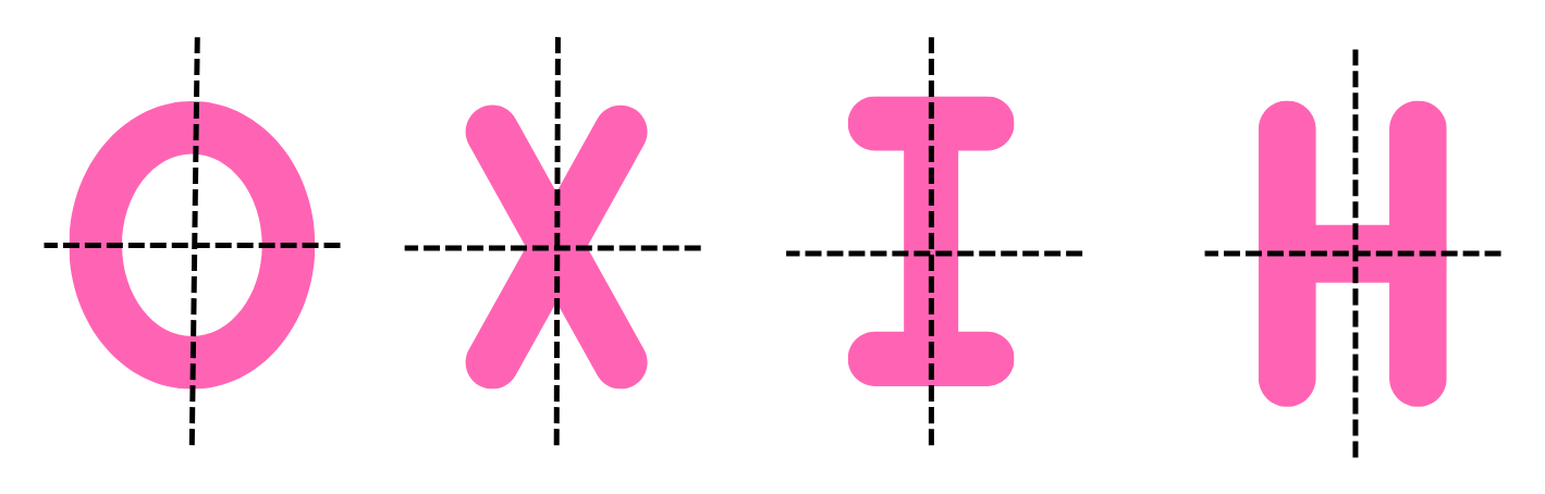Answer: The letters which have reflectional symmetry about both horizontal and vertical mirrors are O, X, I, H. The horizontal and vertical lines of symmetry or the horizontal and vertical mirror lines are represented by the dashed line as shown below: