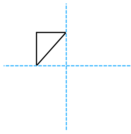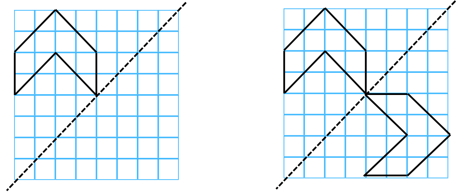The completed shape which is symmetric about the mirror line is shown below (note how we take into account the left-right changes in orientation due to reflection):