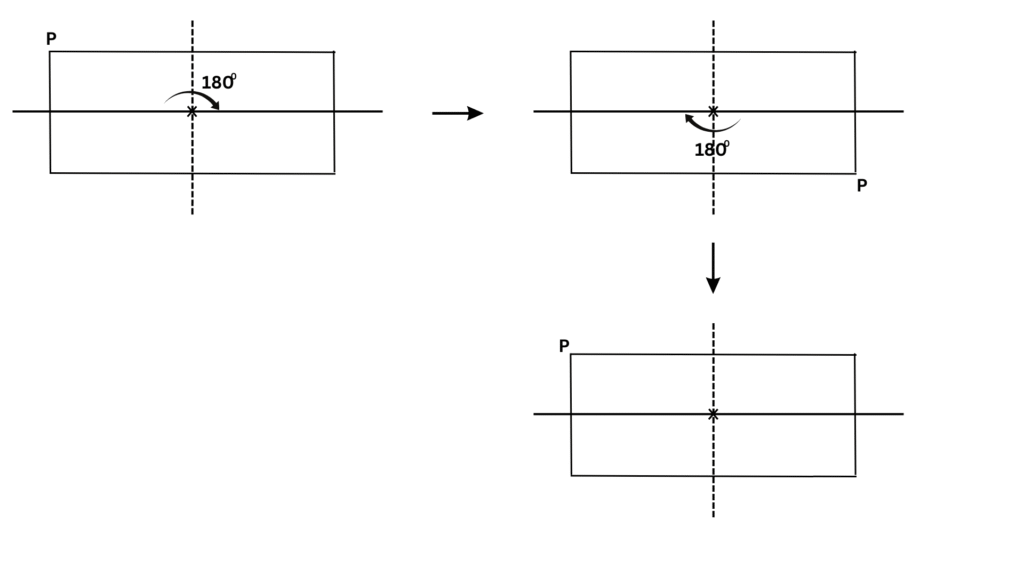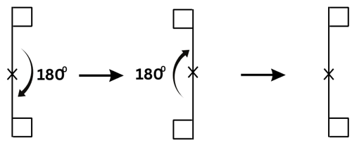 We turn the rectangle about the centre of rotation (marked with an X). In a full 3600 turn, there are precisely two positions (on rotation through the angles 1800 and 3600) when the figure looks exactly the same. Because of this, we can say that it has a rotational symmetry of order 2.