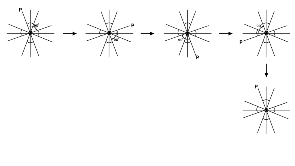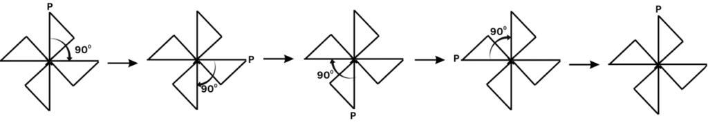 (f) We turn Figure (e) about the centre of rotation (marked with an X). In a full 3600 turn, there are precisely four positions (on rotation through the angles 900, 1800, 2700 and 3600) when the figure looks exactly the same. Because of this, we can say that it has a rotational symmetry of order 4.