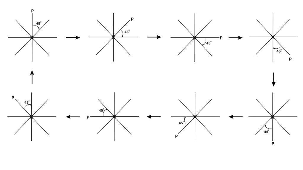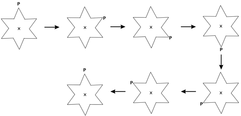 We turn the above figure about the centre of rotation (marked with an X). If you rotate the figure successively by angles of 450 there are precisely eight positions when the figure looks exactly the same in a full 3600 turn. Because of this, we can say that it has a rotational symmetry of order 8.
