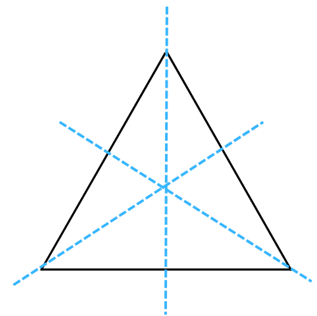 Answer: The line of symmetry is the line(s) about which the figure may be folded so that the two parts coincide (after being folded). An equilateral triangle has 3 lines of symmetry as shown below: