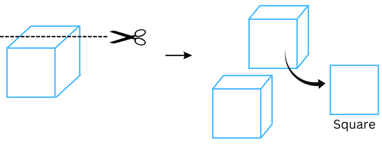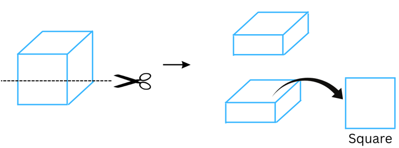 (ii) When a die (cube shaped) is given horizontal cut we also get a square cross-section as shown: