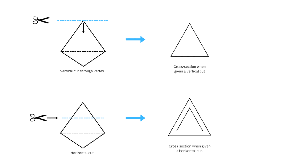 The cross-sections you get when you slice tetrahedron horizontally and vertically are shown below: