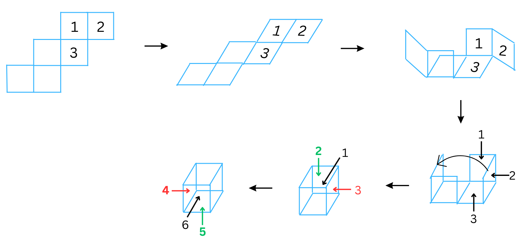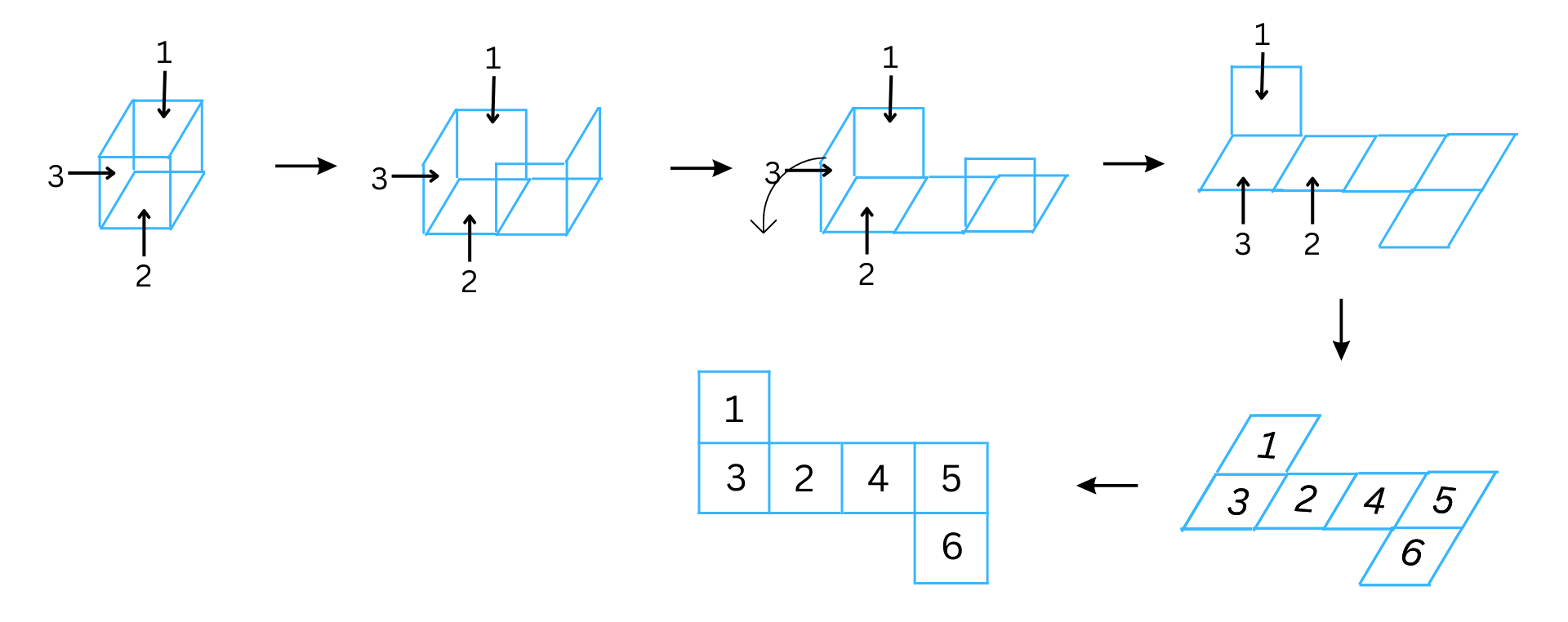 Now, to confirm where the numbers 1, 2, 3 should be on the net, we open the cube (die) again to reform the original net.