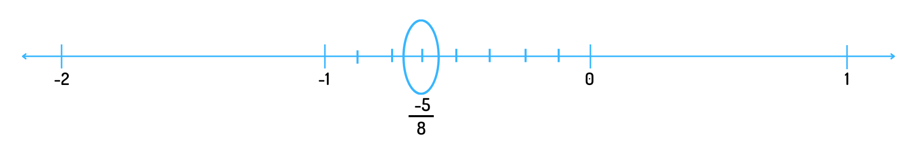 (-5)/8 lies between 0 and -1. The number line between 0 and -1 is divided into 8 equal parts and (-5)/8 is marked on the number line as shown below: