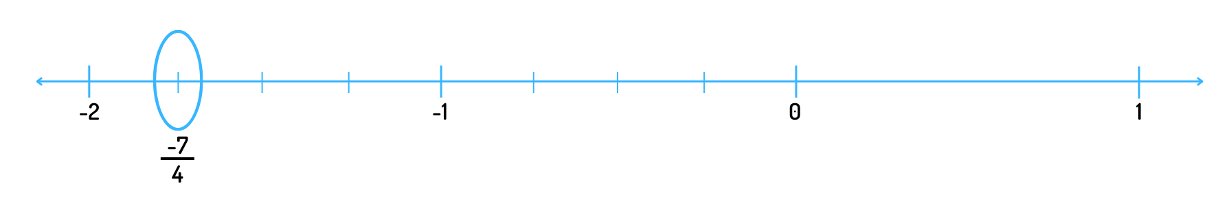 Therefore, (-7)/4 lies between -1 and -2. The number line between -1 and -2 is divided into 4 equal parts and (-7)/4 is marked on the number line as shown below: