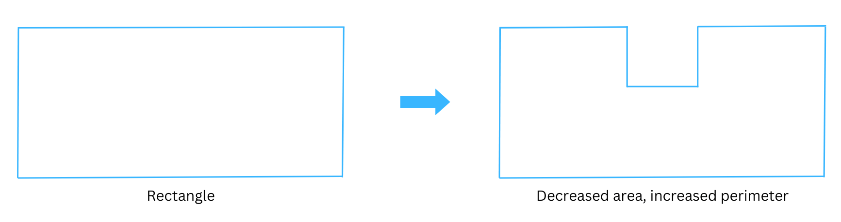 This adds extra boundaries to the rectangle and the perimeter increases. Since the square piece is cut off the area of the rectangle decreases.