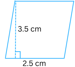 Area of the parallelogram = b × h = 2.5 cm × 3.5 cm = 8.75 cm2.