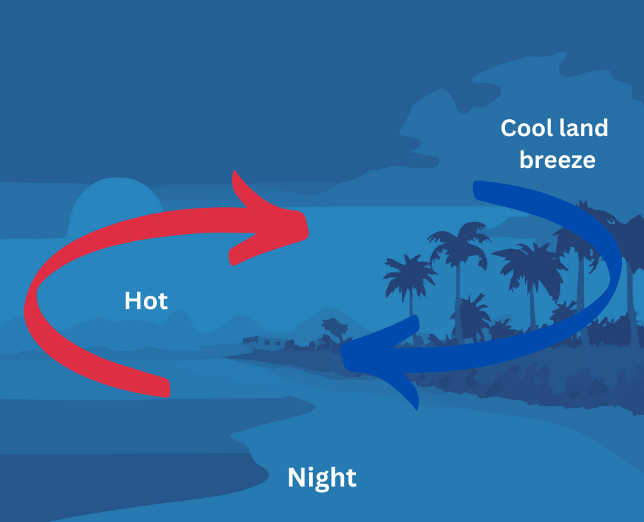 (ii) During the night, the cycle is reversed. The water cools down much slower than the land. Therefore, the air over the sea stays warmer than the air over the land, rises up and the cooler air from the land moves towards the sea to take its place. The cooler air from the land is called land breeze. Since the cooler land breeze blows towards the sea and the warmer air from the sea blows towards the land, the coastal area remains warm during the night as shown below: