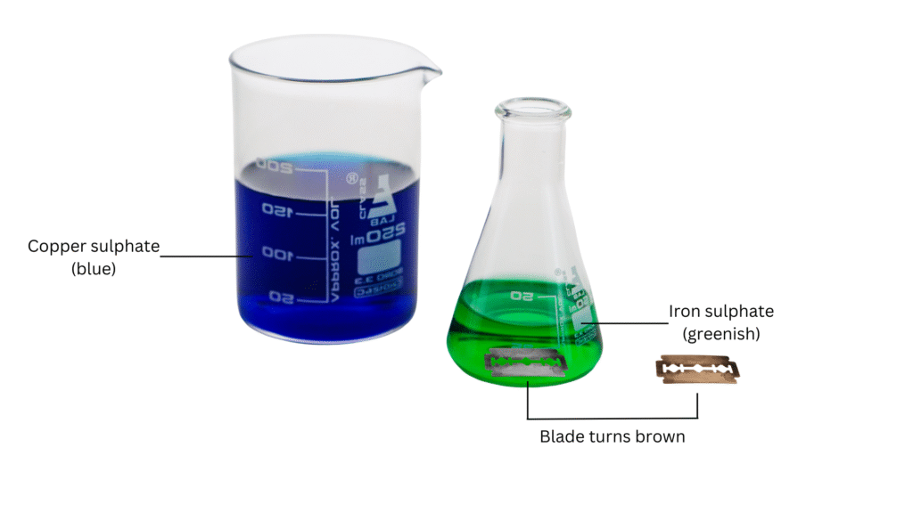 Observation: The copper sulphate solution which was saved was blue in colour. The remaining solution to which the iron blade was added will turn green in colour. Also, the iron blade itself will have turned brown in colour.