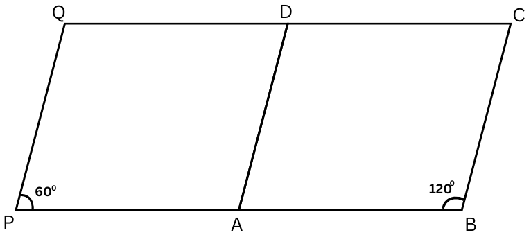Now, ∠DAB = 600 and ∠QPA = 600 and PB is a transversal.