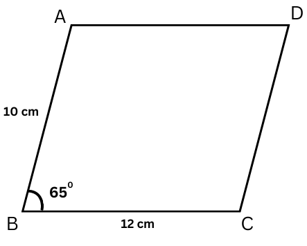 4. In parallelogram ABCD, the length of side AB is 10 cm, and the length of side BC is 12 cm. If the measure of ∠B is 650, find the length of side AD and the measure of angles A, C, and D.