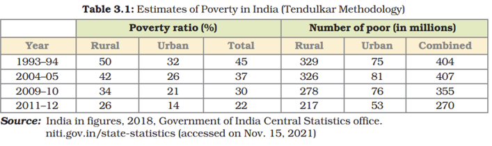 Table 3.1 indicates a substantial decline in poverty ratios in India from about 45% in 1993-94 to 37.2% in 2004-2005. Further downward trend was seen as the figure came down to 22% in 2011-12. The number of poor people living under poverty also declined in the two decades of 70s and 80s The number of poor people in 1973 was 407 million compared to 270 million in 2004-05 which was which was a huge decline.