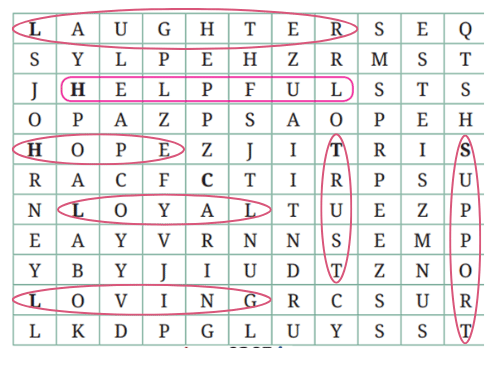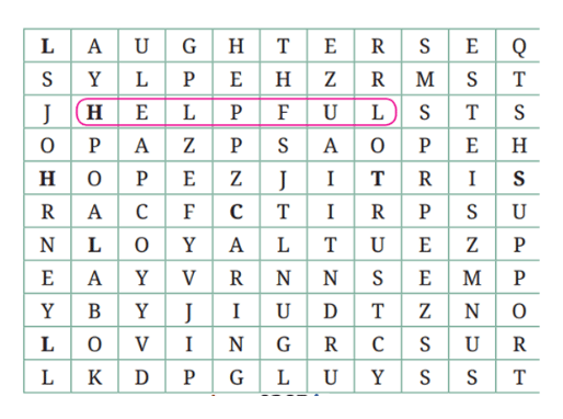 (a) Now, find some more words that are related to friendship from the grid given below. You can search horizontally or vertically. There are eight words. One word has been marked as an example. The first letter of each word has been given in bold.