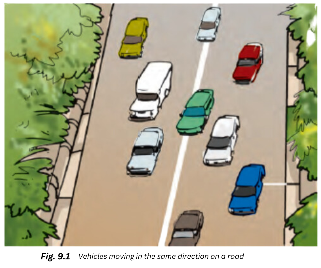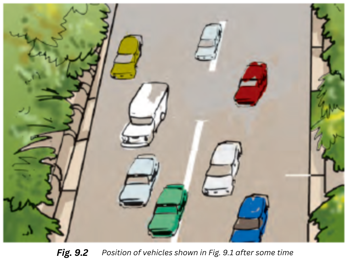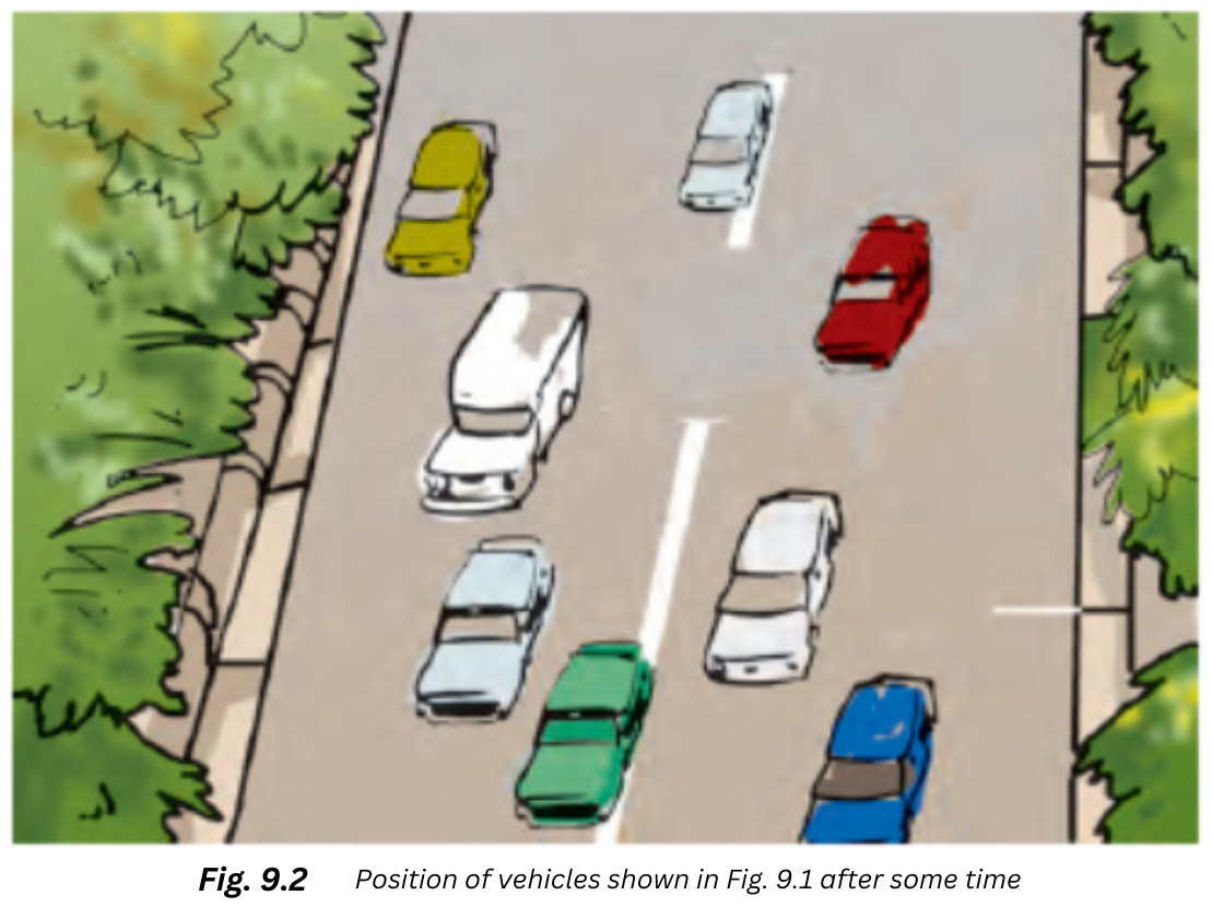 11. Suppose the two photographs, shown in Fig. 13.1 and Fig. 13.2, had been taken at an interval of 10 seconds. If a distance of 100 metres is shown by 1 cm in these photographs, calculate the speed of the fastest car.