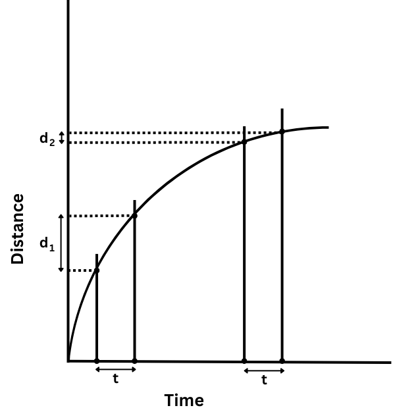 Let us choose two points t and 2t on the time-axis and draw two perpendicular lines passing through t and 2t which cut the graphs at two points. Then from those points draw two horizontal lines cutting the distance-axis at d1 and d2.