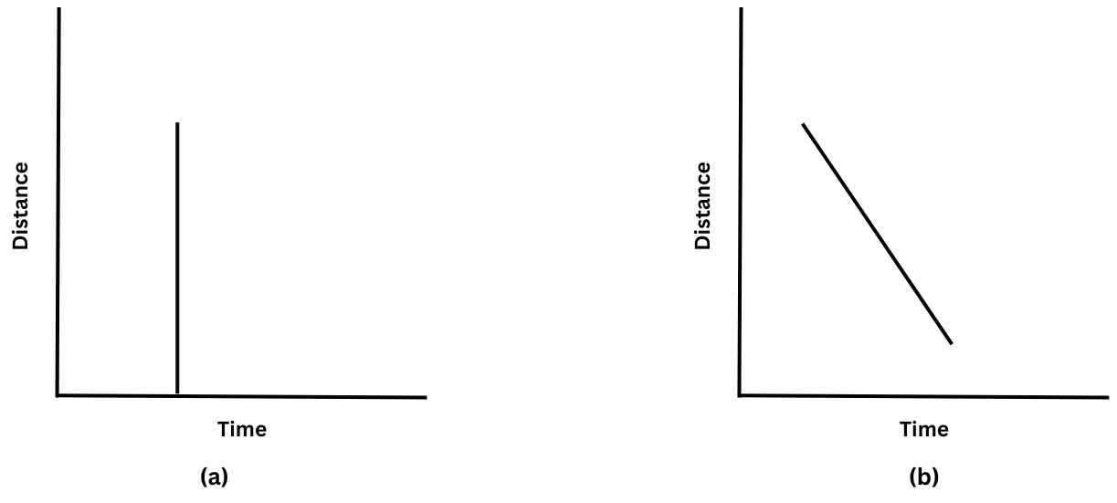 Answer: In graph (a) the straight line perpendicular to the time-axis and parallel to the y-axis means that different distances are covered at the exact same time. This is physically impossible and so graph (a) cannot exist.