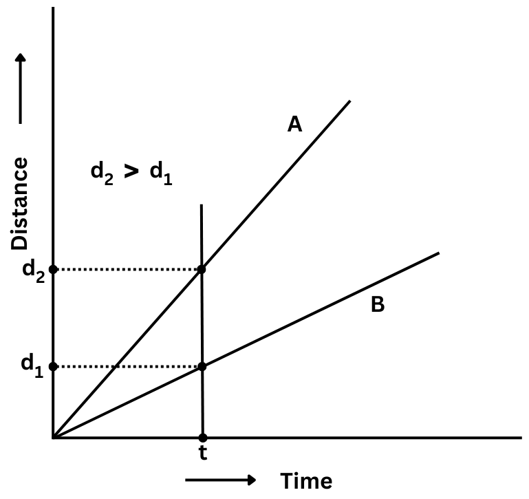 After time t, the vehicle A covers a distance d2 and the vehicle B covers a distance d1 and d2 > d1. It is easy to see that the same result holds for any time other than t.