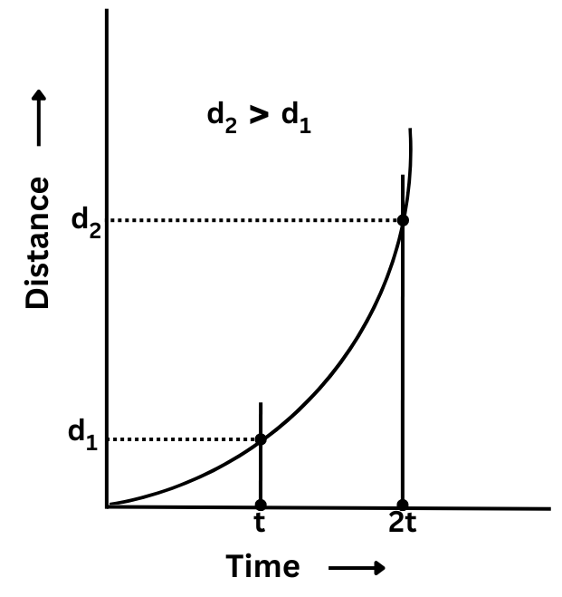 So, a greater distance d1 is covered in the first time period of length ‘t’ and a smaller distance d2 is covered in the second time period of equal length ‘t’.