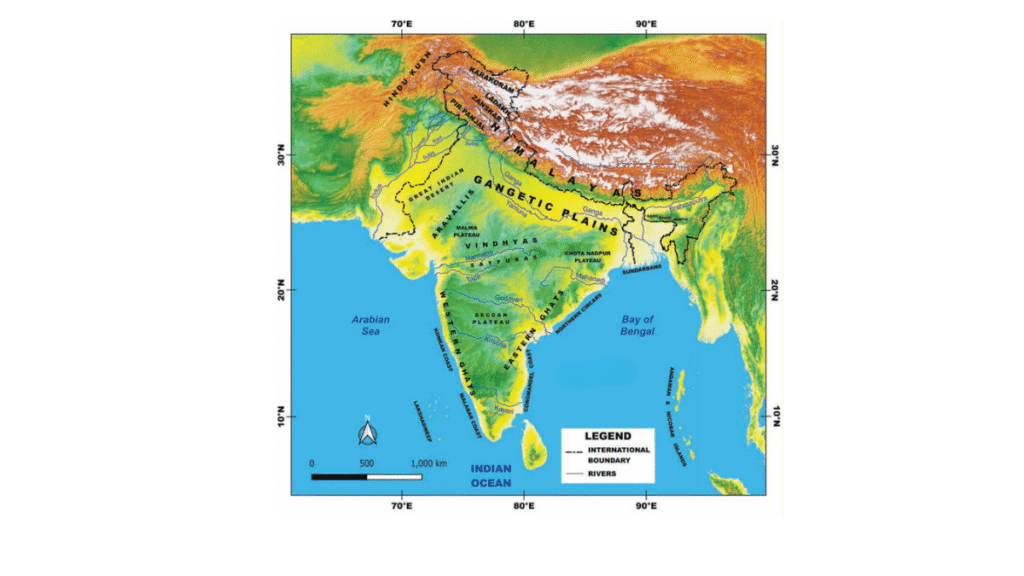 The Himalayas: These mountains form the northern boundary of India and are very important because they protect us from cold winds from Central Asia and bring rainfall by blocking monsoon winds. They are also the source of many important rivers like the Ganga and the Yamuna.