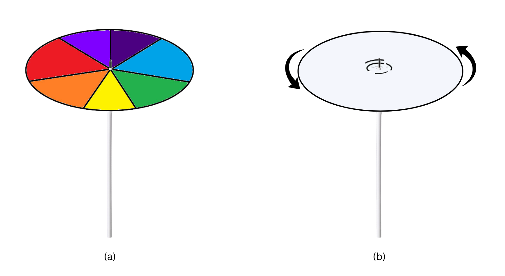 “Take a circular cardboard disc of about 10 cm diameter. Divide this disc into seven segments. Paint the seven rainbow colours on these segments as shown in Fig. 11.31 (a). You can also paste, coloured papers on these segments. Make a small hole at the centre of the disc. Fix the disc loosely on the tip of a refill of a ball pen. Ensure that the disc rotates freely [Fig. 11.31 (a)]. Rotate the disc in the daylight. When the disc is rotated fast, the colours get mixed together and the disc appears to be whitish [Fig. 11.31 (b)]. Such a disc is popularly known as Newton’s disc.” – Solved.