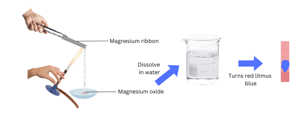 Metals like magnesium give basic oxides as is indicated by the change of red litmus to blue when the oxide is dissolved in water. The reactions for the experiment are shown below:
