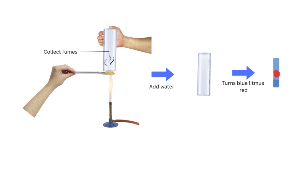 - Now burn sulphur powder. Place a test tube over the burning sulphur to collect the fumes produced.