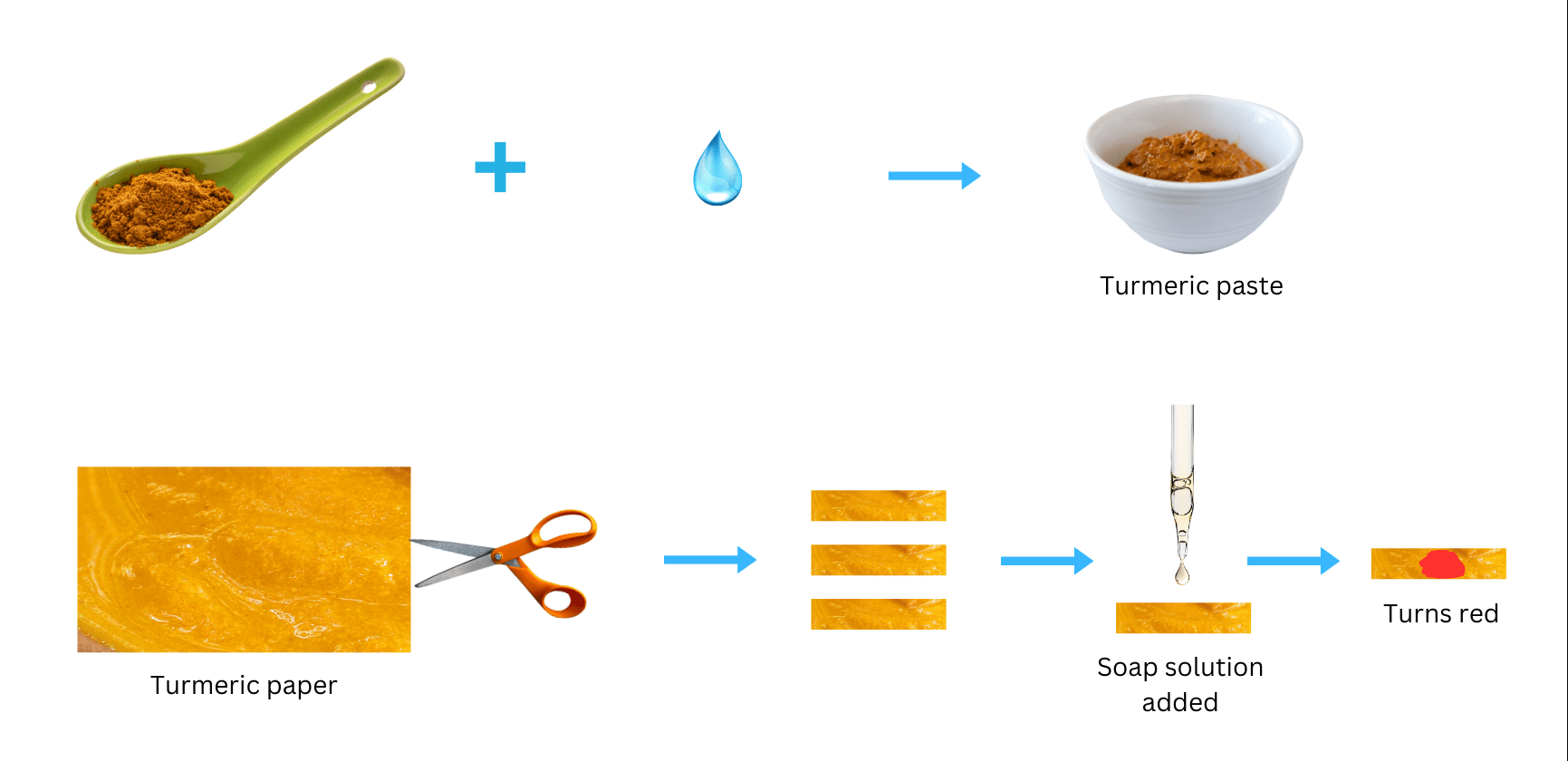 - Put a drop of soap solution on the strip of turmeric paper. What do you observe?