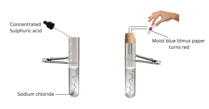 Materials Required: Test tube, tongs, cork, delivery tube, dropper, 1g solid NaCl,concentrated sulphuric acid, dry and wet blue litmus paper.