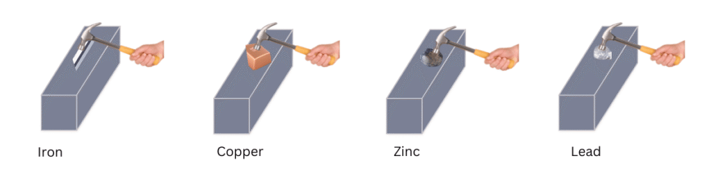 Aim: To strike pieces of iron, zinc, lead and copperwith a hammer and conclude based on the observations.