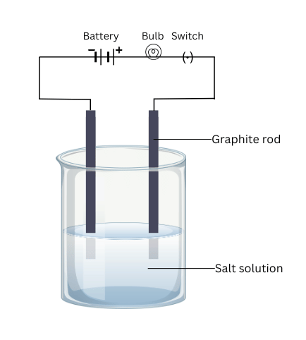 Materials Required: Sodium chloride, potassium iodide, barium chloride, metal spatula, burner,water, petrol, kerosene, graphite electrodes, battery, bulb, switch, electrical wires.
