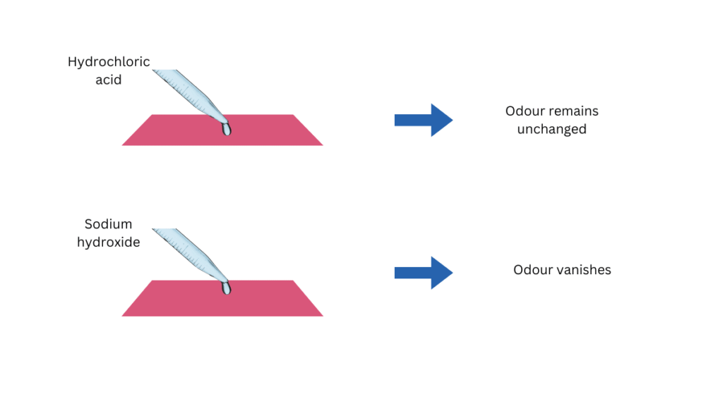 - The odour of the cloth strips remains unchanged in contact with HCl. The cloth strips become odourless in contact with NaOH.