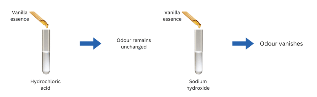 - Take some dilute HCl solution in one test tube and dilute NaOH solution in another. Add a few drops of dilute vanilla essence to both test tubes and shake well. Check the odour once again and record changes in odour, if any.