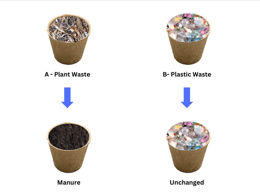 ” Take two pots and fill each pot half with soil. Mark them A and B. Put plant waste in pot A and things like polythene bags, empty glass bottles and broken plastic toys in pot B. Put the pots aside. Observe them after 3-4 weeks.” – Solved.