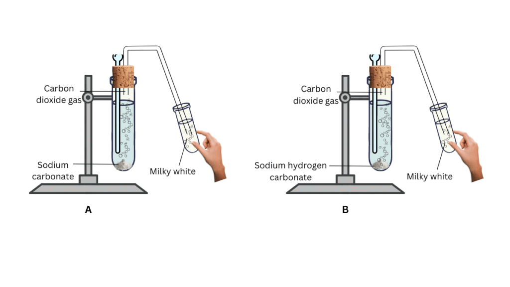 Take about 0.5 g of sodium carbonate (Na2CO3) in test tube A and about 0.5 g of sodium hydrogencarbonate (NaHCO3) in test tube B.