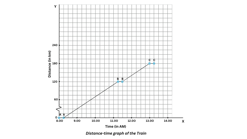 “The times of arrival and departure of a train at three stations A, B and C and the distance of stations B and C from station A are given in Table 7.4. Plot and interpret the distance-time graph for the train assuming that its motion between any two stations is uniform.” – Solved.